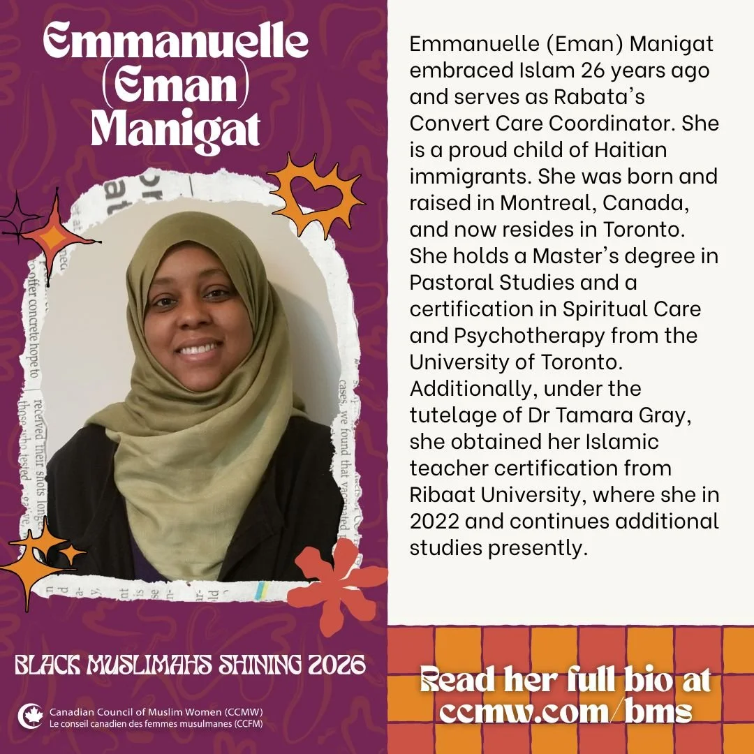 Emmanuelle (Eman) Manigat embraced Islam 26 years ago and serves as Rabata's Convert Care Coordinator. Emmanuelle (Eman) Manigat is a proud child of Haitian immigrants. She was born and raised in Montreal, Canada, and now resides in Toronto. She holds a Master's degree in Pastoral Studies and a certification in Spiritual Care and Psychotherapy from the University of Toronto. Additionally, under the tutelage of Dr Tamara Gray, she obtained her Islamic teacher certification from Ribaat University, where she in 2022 and continues additional studies presently.