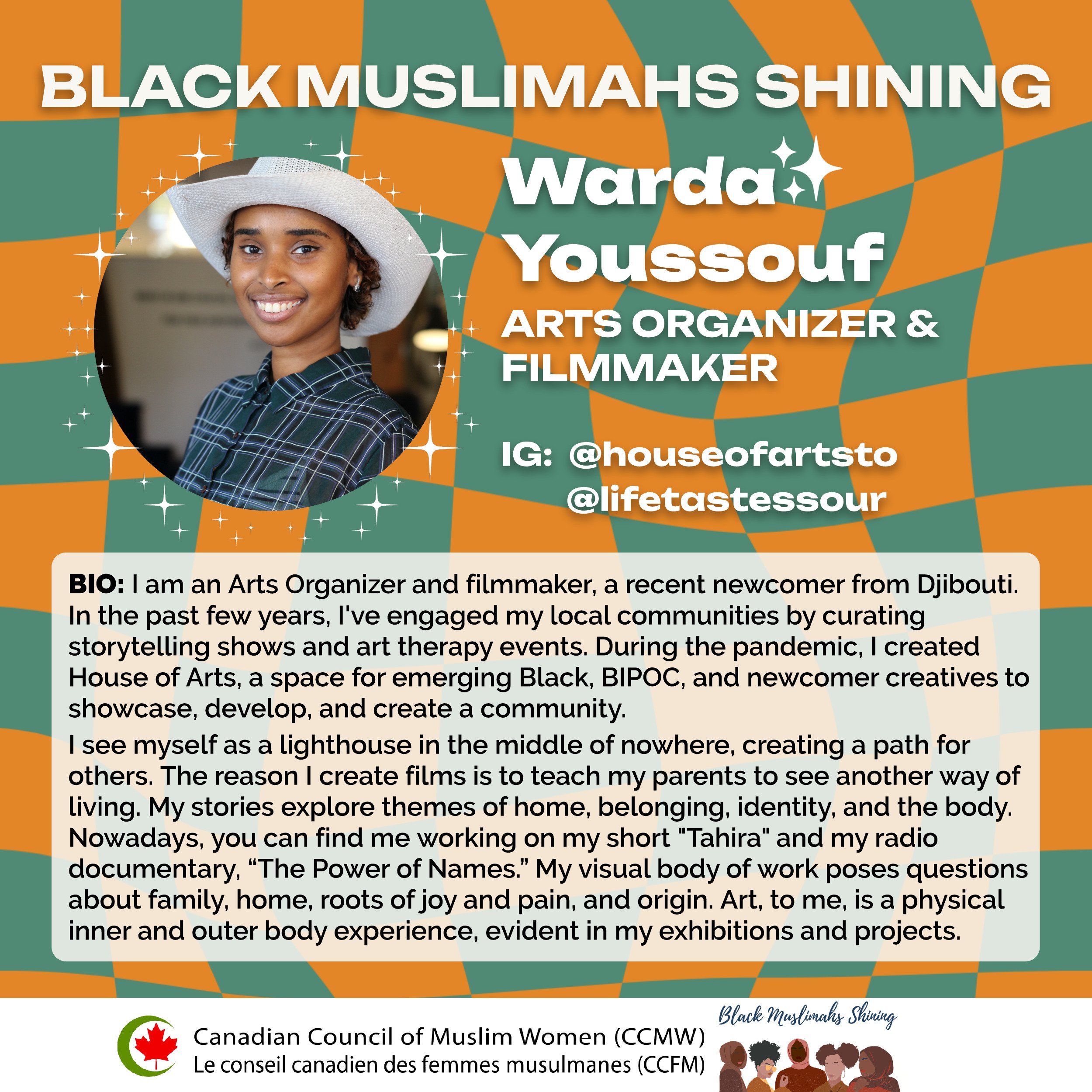 I am an Arts Organizer and filmmaker, a recent newcomer from Djibouti. In the past few years, I've engaged my local communities by curating storytelling shows and art therapy events. During the pandemic, I created House of Arts, a space for emerging Black, BIPOC, and newcomer creatives to showcase, develop, and create a community.