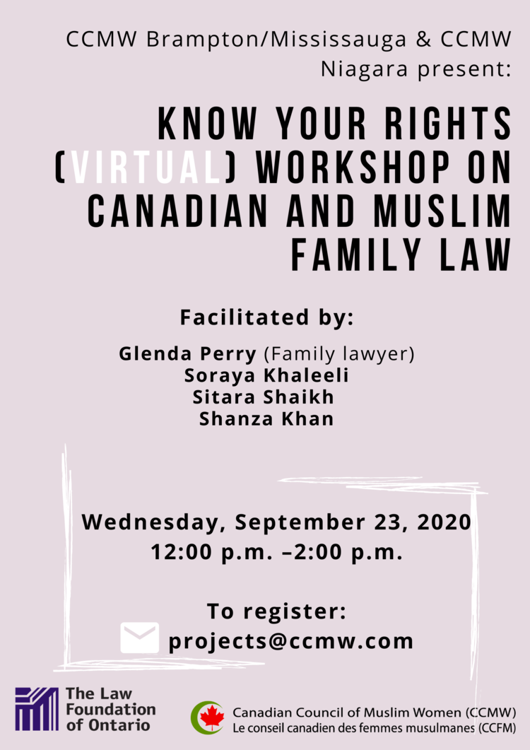 The aim of this virtual workshop to build the skills of individuals, organizations, and communities in the Brampton, Mississauga, and Niagara area so that they are better equipped to increase access to justice for Canadian Muslim women in family law issues. The goal of this workshop is to serve community and build the capacity of CCMW chapter members, legal professionals, community leaders, service providers, and educators across Canada.