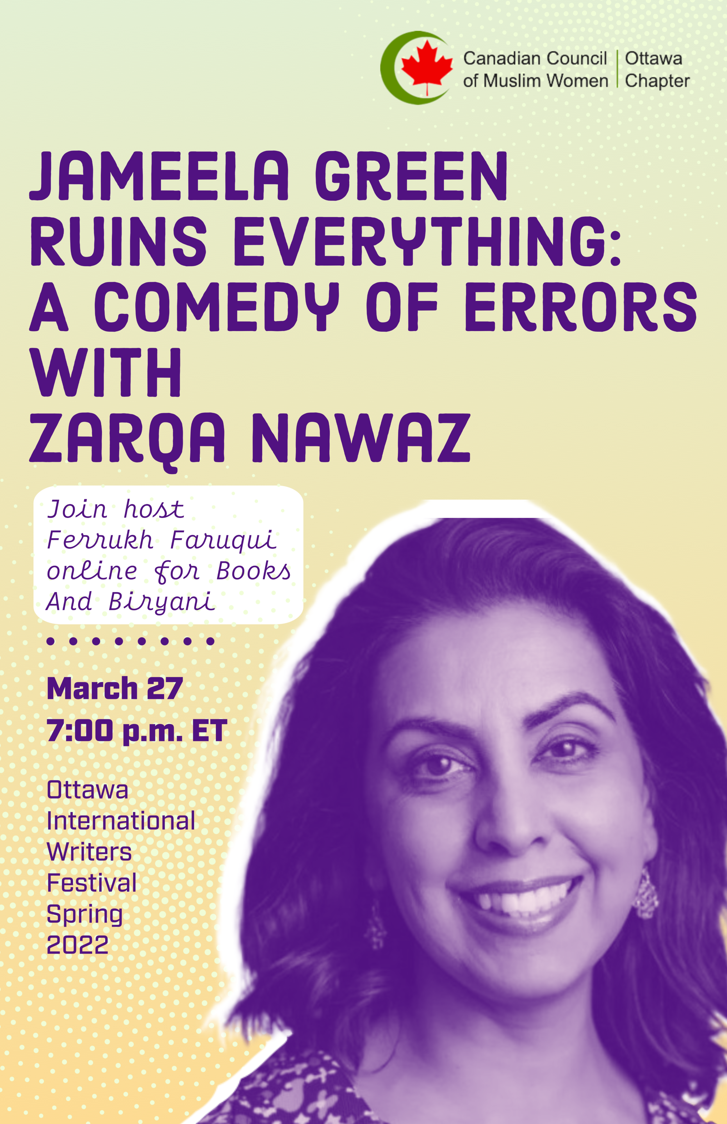 Books and Biryani Spring 2022 welcomes Zarqa Nawaz, the creator of CBC’s Little Mosque on the Prairie as she launches her debut novel Jameela Green Ruins Everything.