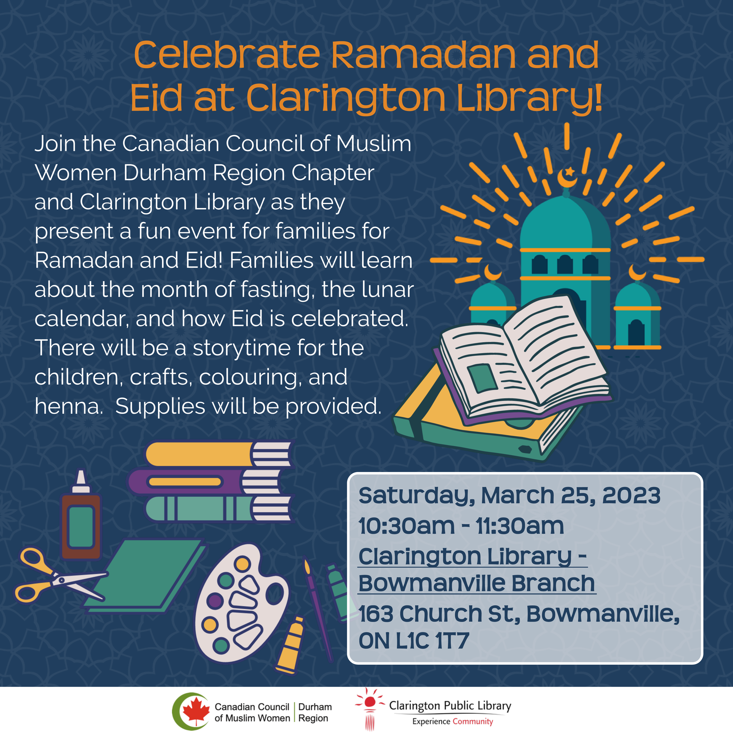 Join the Canadian Council of Muslim Women Durham Region Chapter and Clarington Library as they present a fun event for families for Ramadan and Eid! Families will learn about the month of fasting, the lunar calendar, and how Eid is celebrated. There will be a storytime for the children, crafts, colouring, and henna. Supplies will be provided.