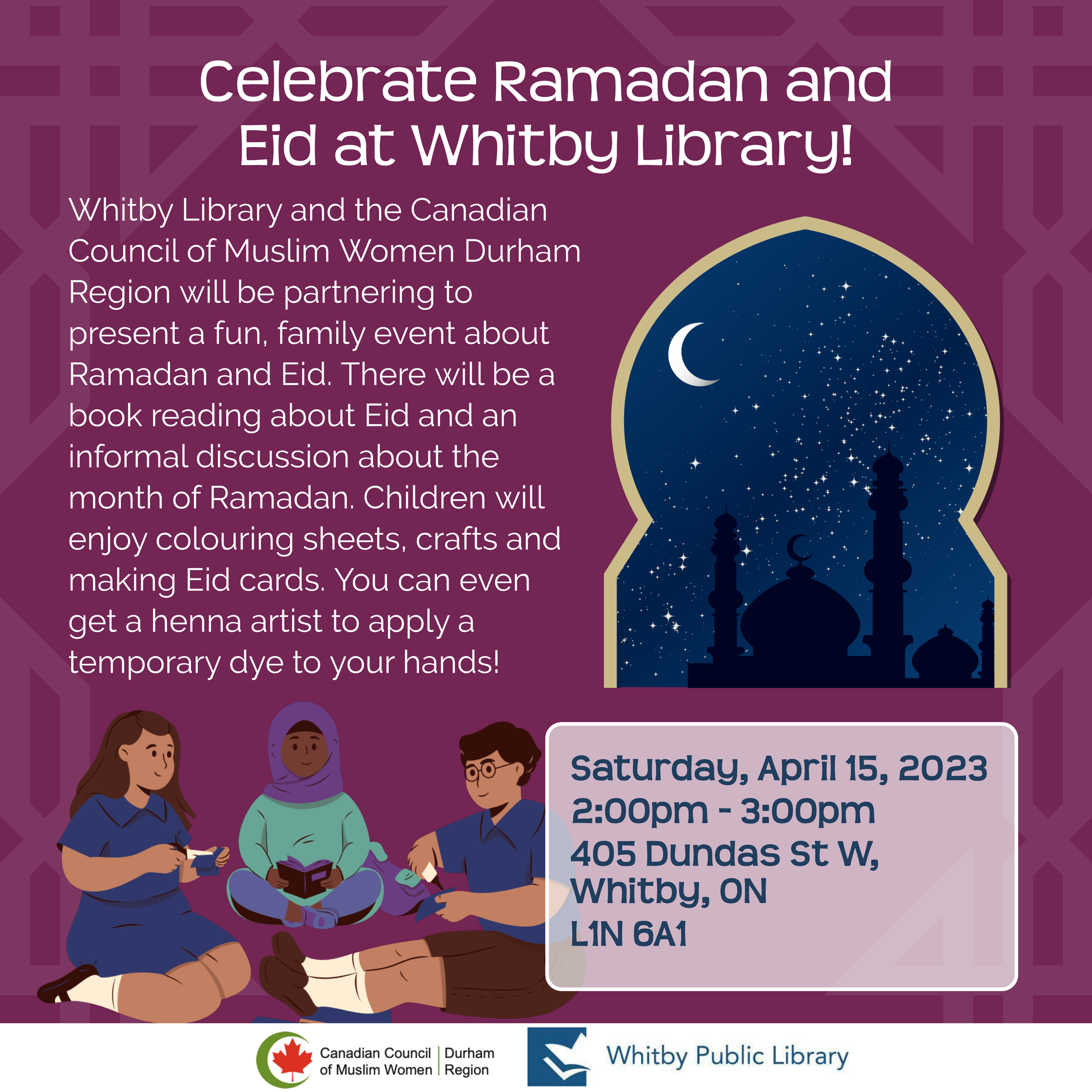 Whitby Library and the Canadian Council of Muslim Women Durham Region will be partnering to present a fun, family event about Ramadan and Eid. There will be a book reading about Eid and an informal discussion about the month of Ramadan. Children will enjoy colouring sheets, crafts, and making Eid cards. You can even get a henna artist to apply a temporary dye to your hands!