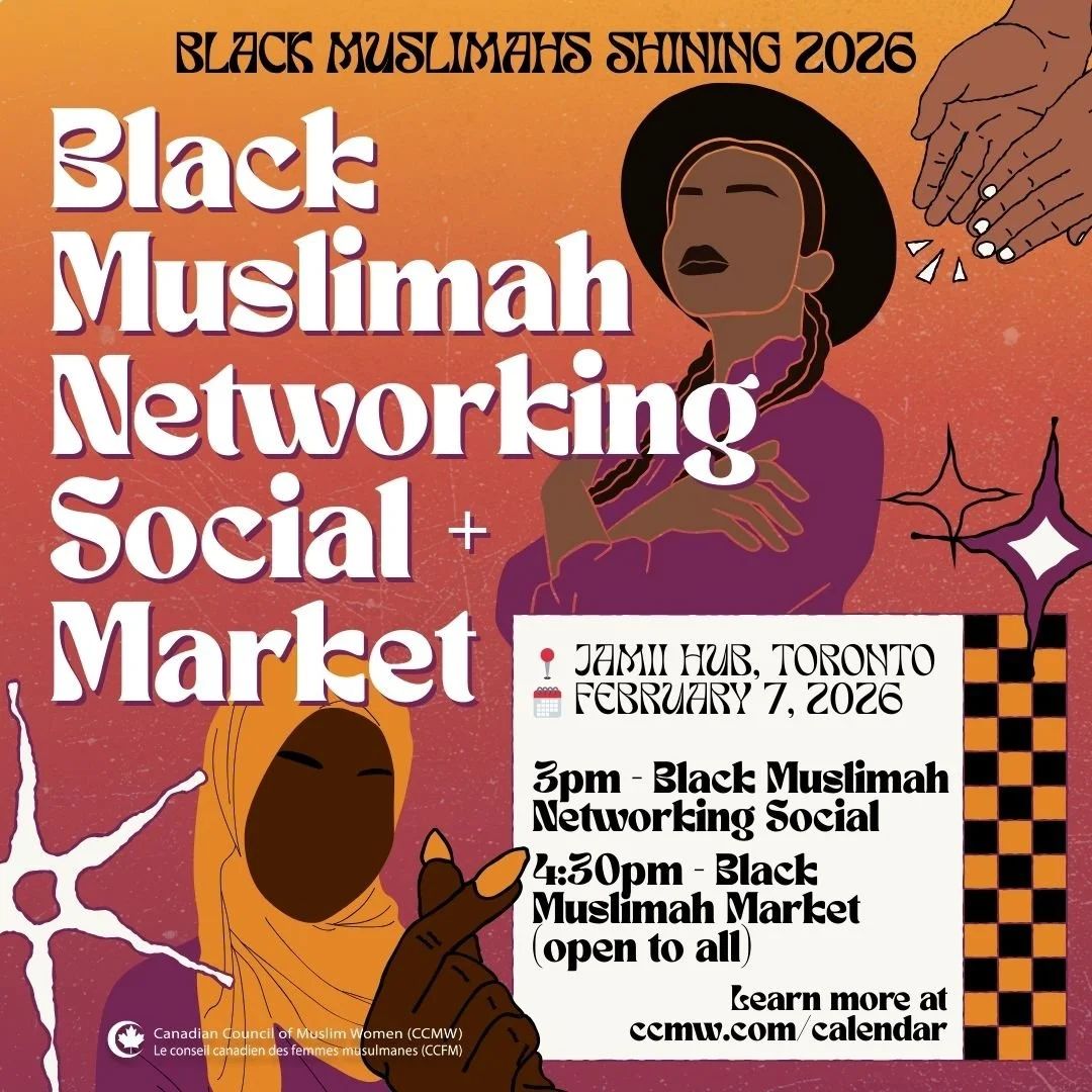 As part of Black History Month, the Canadian Council of Muslim Women (CCMW) invites you to our Black Muslimah Networking Social & Market — a two-part in-person gathering that centres Black Muslim women while welcoming the wider community to celebrate and support Black Muslimahs.